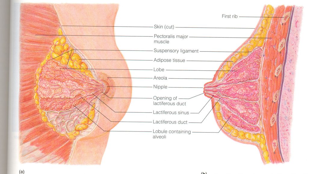 A mama é formada em parte por tecido glandular e em parte por tecido conjuntivo e gordura, e tem a seguinte estrutura: